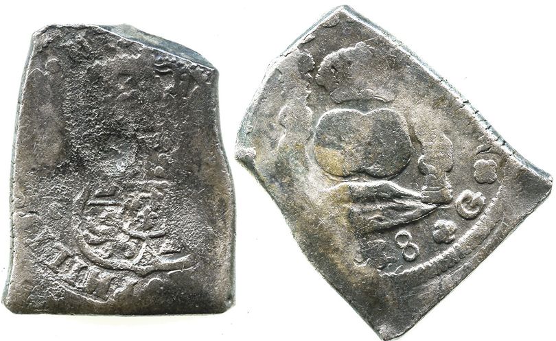 Guatemala, cob 8 reales, (17)38(J). S-G1; KM-6; CT-596. 26.7 grams. Broad, rectangular flan with bold date and mintmark and nearly full pillars/worlds/waves, lightly corroded shield with small natural pit, darkly toned all over. Recovered from: Reijgersdaal, sunk in 1747 off South Africa