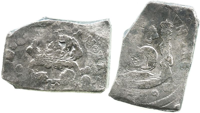 Guatemala, cob 8 reales, (17)39(J). S-G1; KM-6; CT-597. 26.8 grams. Solid, sharply rectangular flan with somewhat weak but virtually uncorroded details, darkly toned all over. Recovered from: Reijgersdaal, sunk in 1747 off South Africa