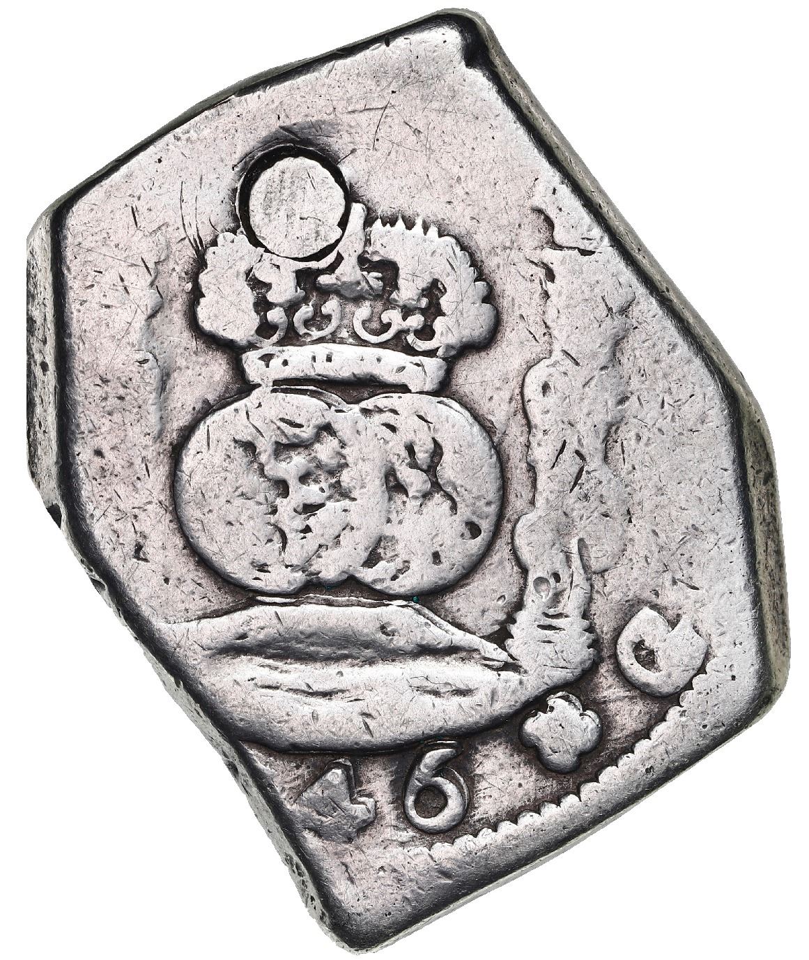 Guatemala, cob 8 reales, (17)46(J), Philip V, very rare. S-G1; Cal-1253; KM-6; JP-8R14b. 26.73 grams. Bold VF+ with neatly plugged hole above both crowns, bold full 46 of date and full mintmark, toned around details. Pedigreed to the Antigua collection.