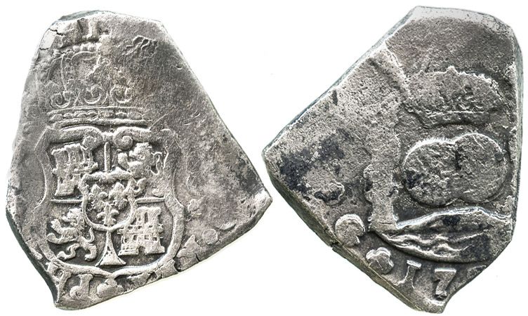Guatemala, cob 8 reales, 173(?)J. S-G1; KM-6. 26.2 grams. Bold full shield and globes on a very thick and solid flan (minimal surface corrosion only), toned around details, bold 17 of date, interestingly triangular flan, scarce type for this wreck With certificate from the salvagers #B3724. Recovered from: Hollandia, sunk in 1743 off the Scilly Isles, west of England