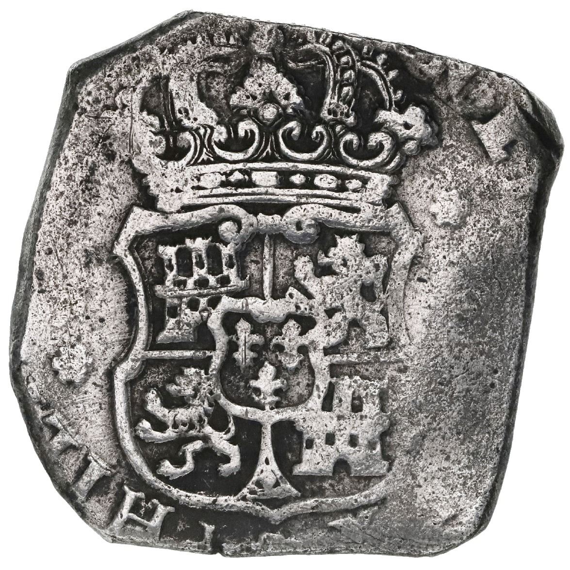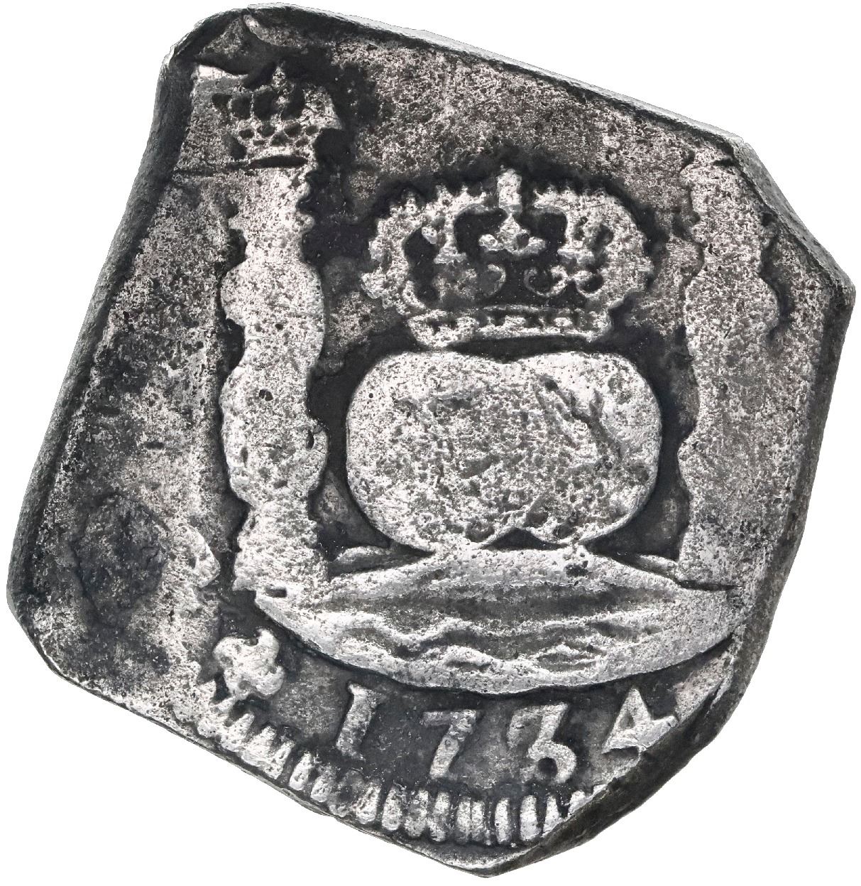 Guatemala, cob 8 reales, 1734J, rare. S-G1; Cal-1238; KM-6; JP-8R2. 26.58 grams. Bold AVF with full date, choice crown above globes, well-detailed full crown and shield, with toning and dark encrustation in crevices (good contrast), all on a squarish flan, particularly rare as unholed. Pedigreed to the Antigua collection.