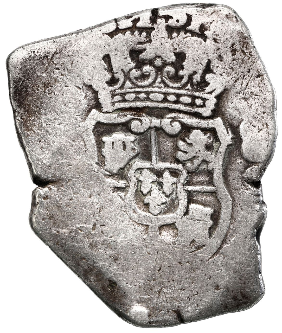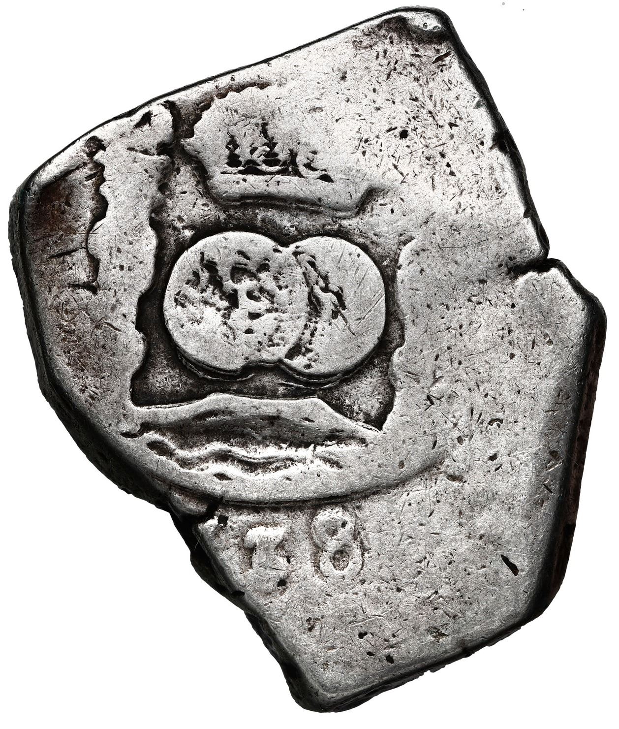 Guatemala, cob 8 reales, 1738 (J). JP-8R6; S-G1; Cal-1242; KM-6. 26.53 grams. Bold full globes and waves with weak and probably lightly tooled date below, nice bold crown and shield, Fine with toning in crevices, scarce as non-salvage and non-holed. Pedigreed to the Ponterio auction of February 1997, with original lot-tag 1409.