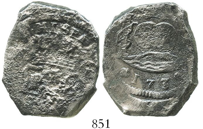 Guatemala, cob 8 reales, 1739(J). S-G1. 24.6 grams. Mostly bold date below most of pillars design, shield side moderately corroded, toned all over. Recovered from: Reijgersdaal, sunk in 1747 off South Africa