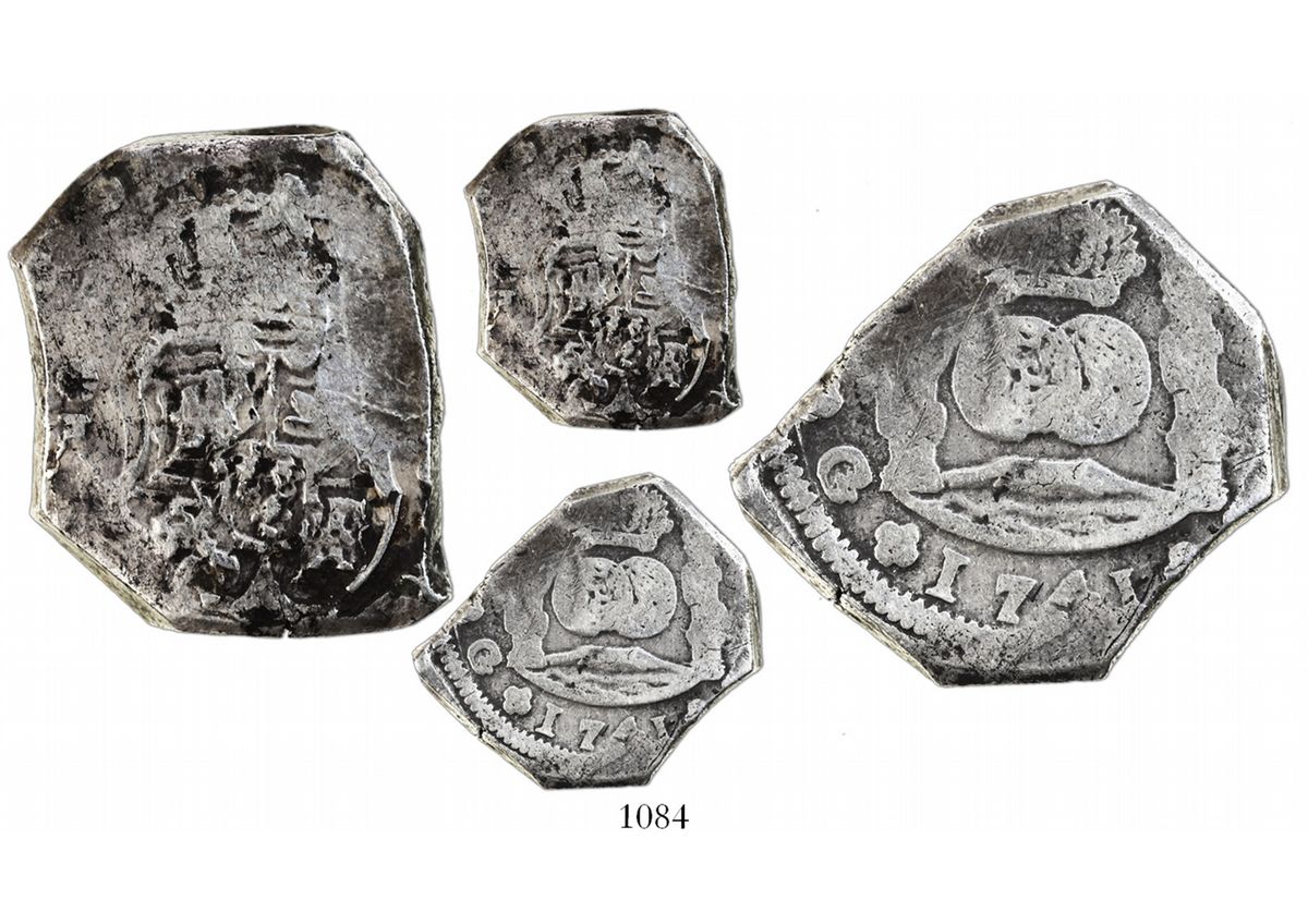 Guatemala, cob 8 reales, 1741J. S-G1; CT-600; KM-6. 27.31 grams. Choice, unholed Fine (very rare thus) with full date, nearly full pillars-and-globes, full but doubled shield, good toning, surely among the finest known for this uncommon date.