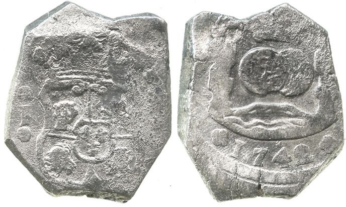 Guatemala, cob 8 reales, 1742J. S-G1; KM-6; CT-601. 26.6 grams. Full date, excellent globes and waves, lightly corroded shield, solid flan, toned. Recovered from: Reijgersdaal, sunk in 1747 off South Africa