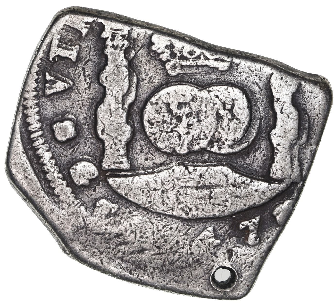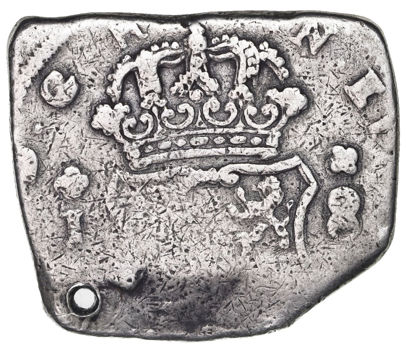 Guatemala, cob 8 reales, 1747J, Ferdinand VI, rare. S-G1a; Cal-418; KM-12; JP-8R15. 26.17 grams. Broad flan with bold full pillars-globes-waves and choice full crown above shield, bold 47 of date and left mintmark, also full assayer and denomination, VF with choice (contrasting) toning but lots of tiny marks, holed at edge. Pedigreed to the Antigua collection.