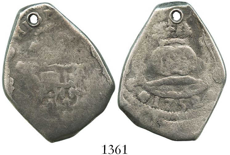 Guatemala, cob 8 reales, 1752J. S-G2; KM-12. 26.6 grams. Full date and inner details on that side, the shield side much weaker, Fine with light porosity, holed at top.