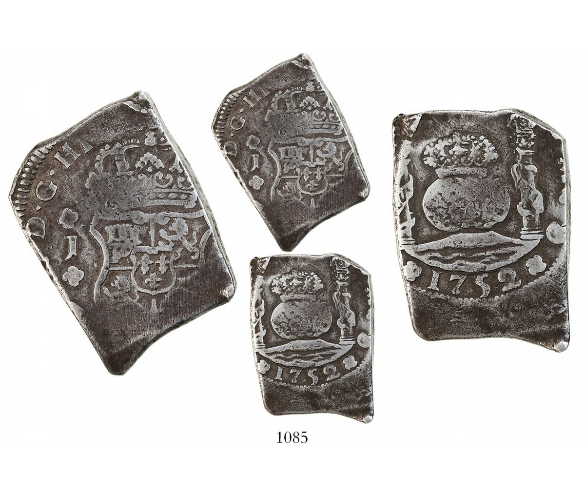 Guatemala, cob 8 reales, 1752J. S-G2; CT-284; KM-12. 26.91 grams. Choice specimen with full date below virtually full central design, bold full assayer to left of nearly full crowned shield, unholed VF+ (exceptional grade) with lovely toning all over, a common date but among the finest Guatemala cobs we have ever seen! Pedigreed to the Lepczyk auction of October 1983, lot #1281.