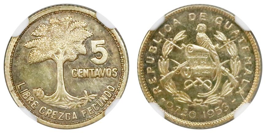 Guatemala, gold off-metal issue 5 centavos, 1953, very rare, NGC MS 64, ex-Richard Stuart. KM-257.1A. Choice and lustrous, brassy in color with traces of toning, from a mintage of only 25 pieces, tied with one other for finest known in NGC census. Pedigreed to the Richard Stuart collection. NGC #4825016-001.