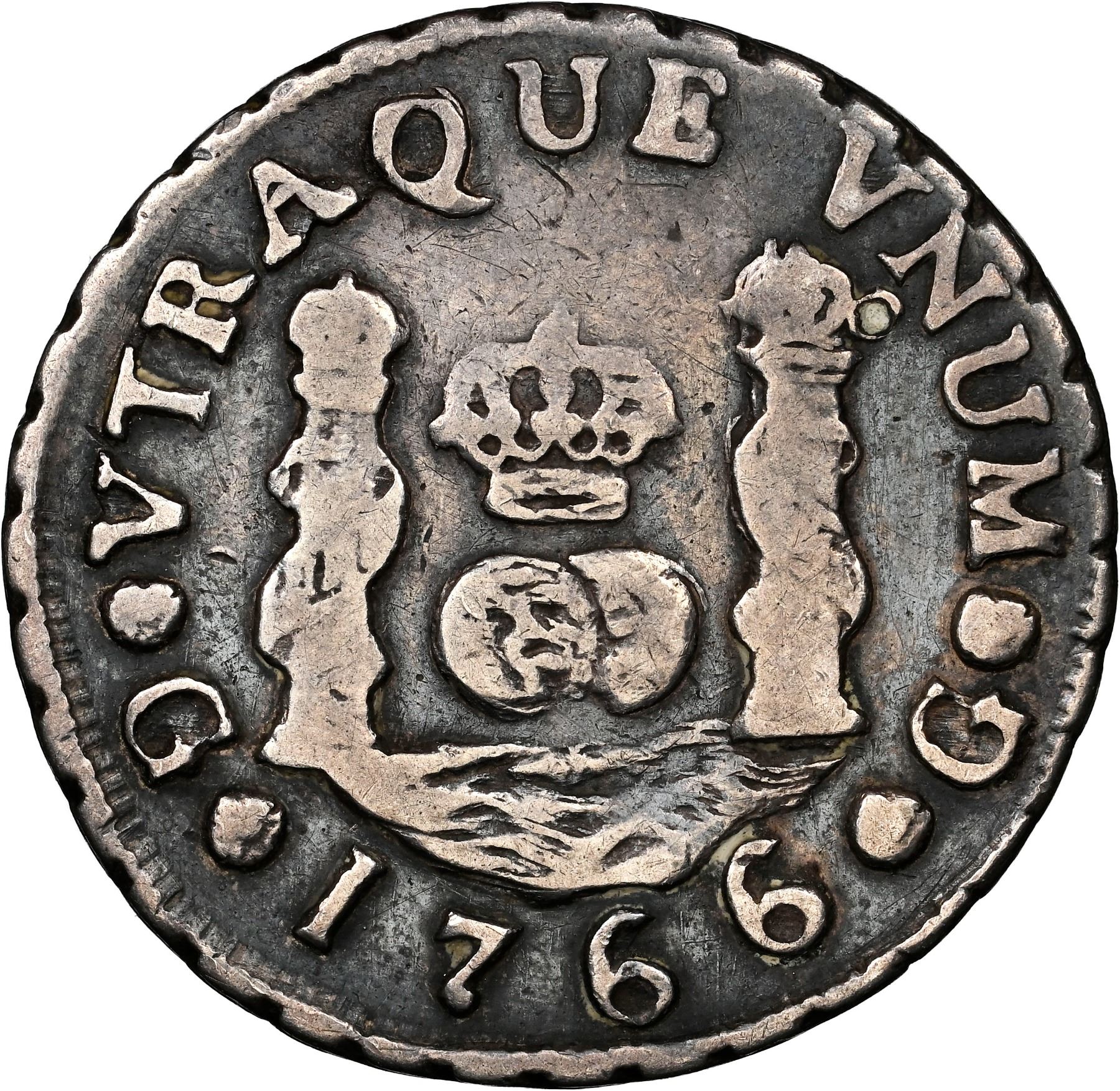 Guatemala, pillar 1 real, Charles III, 1766 P, rare, NGC VF details / obverse damage, ex-Amat, ex-Johnson. JP-1R35; Yonaka-G1.66; KM-24; Cal-326. Light high points contrasted against dark cobalt fields, small pockmark on obverse, rare date (rated as R3 in Yonaka). Pedigreed to the Virrey Amat and Ray Johnson Collections. Please use this link to verify the certification number