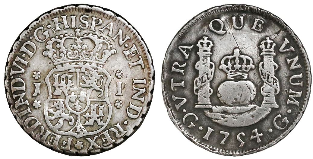 Guatemala, pillar 1 real, Ferdinand VI, 1754J.
