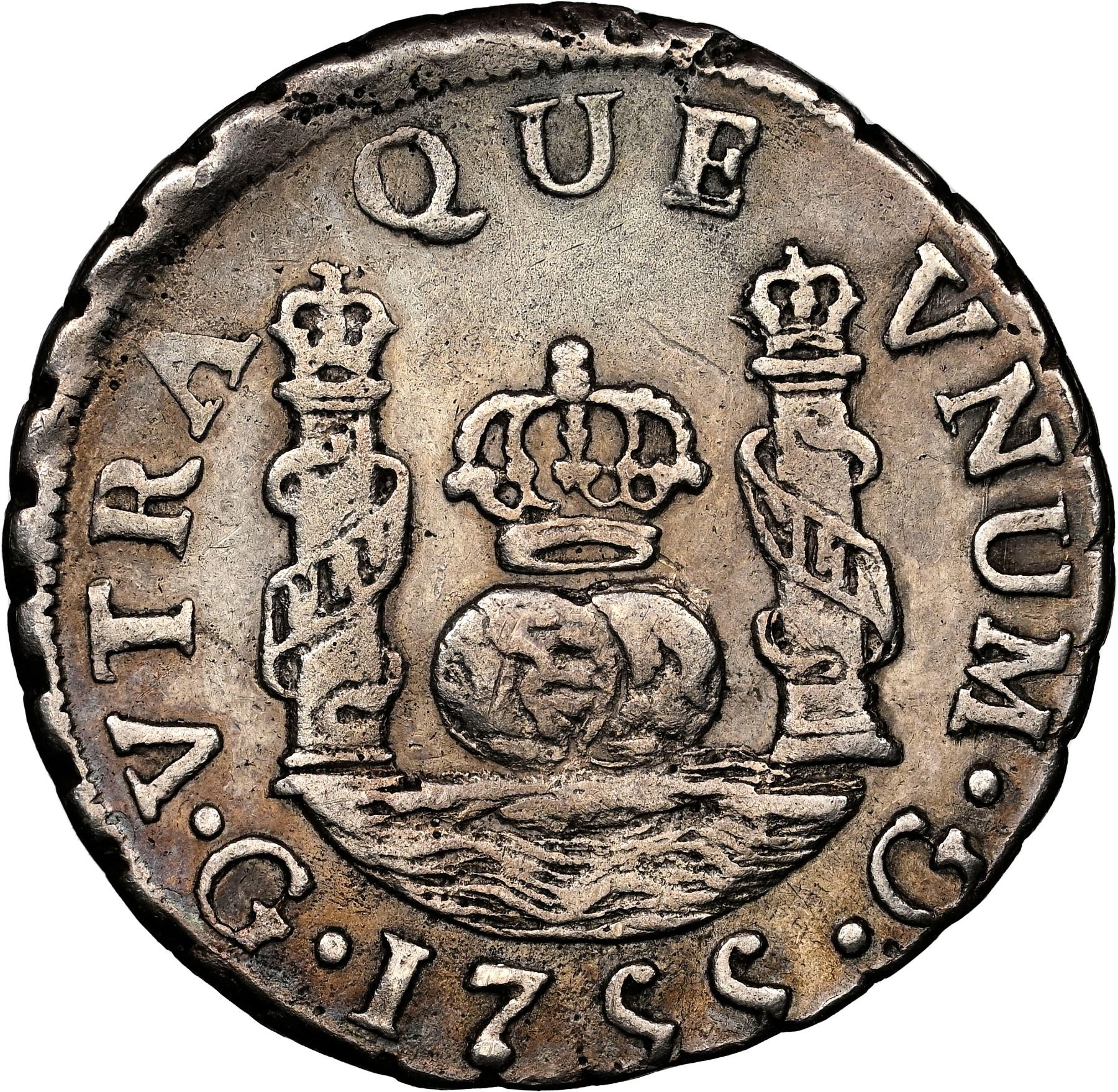 Guatemala, pillar 1 real, Ferdinand VI, 1755 J, rare, NGC AU details / plugged.