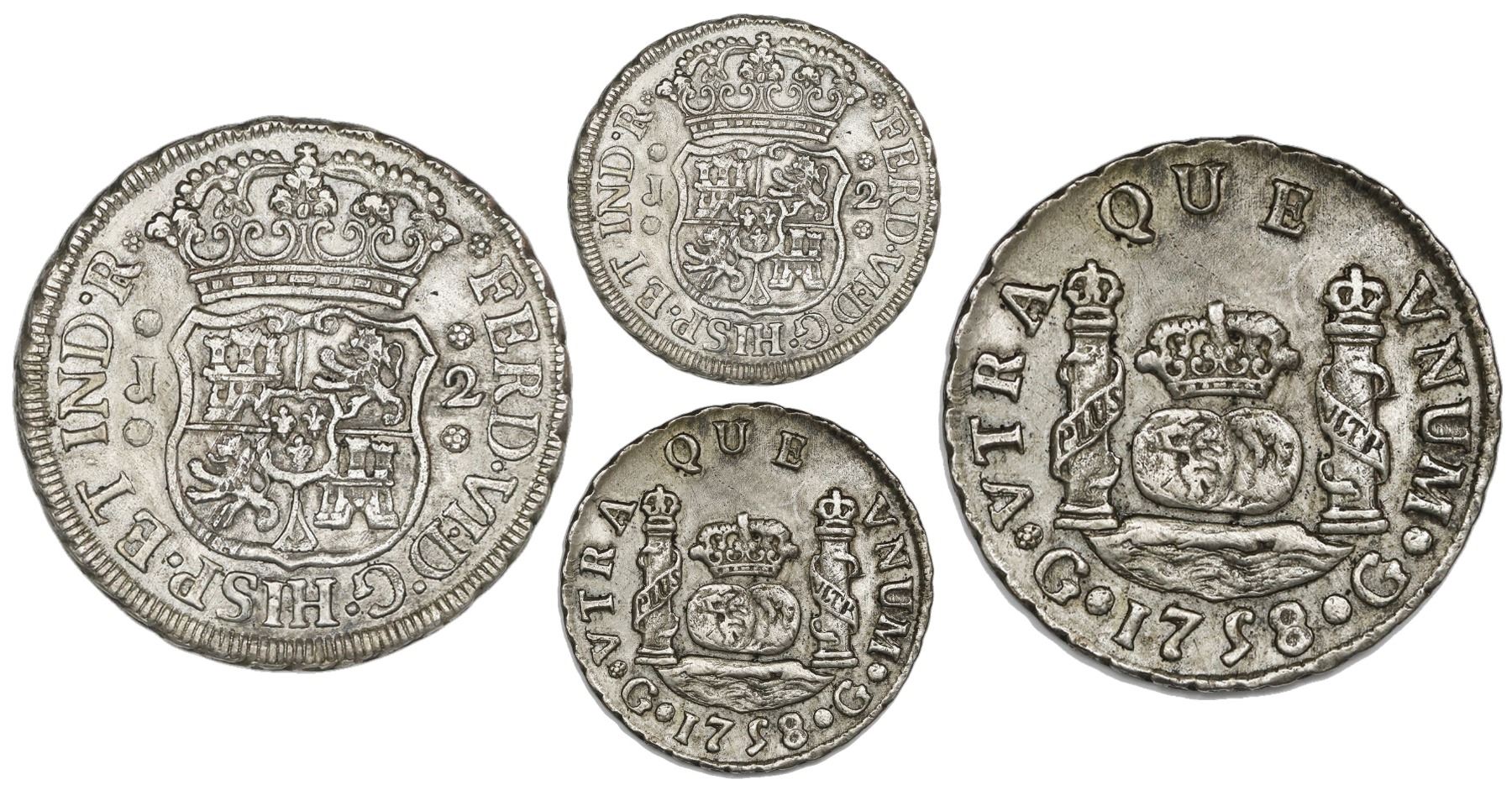 Guatemala, pillar 2 reales, Ferdinand VI, 1758J, large rosettes, rare. Yonaka-G2-58a; Cal-256; KM-20. 6.77 grams. Bold AU with light toning, adjustment marks on shield, extremely rare variety with enhanced-rosette stops (on raised circles) in legends and above and below the denomination and assayer, most likely the finest known for both the date and the variety, important coin for the Guatemala specialist.