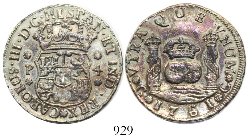 Guatemala, pillar 4 reales, Charles III, 1761P. KM-26; CT-1044. 13.36 grams. Deeply rainbow-toned XF for the type, parts of rims crude due to size and centering, expertly repaired at top.