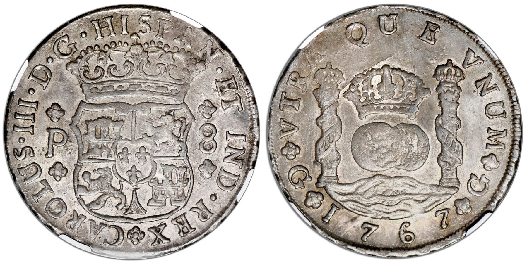 Guatemala, pillar 8 reales, Charles III, 1767P, NGC AU 53. KM-27.1; CT-816. Richly toned and well detailed for the type (arguably AU-58 quality), minor natural flaw at top of left pillar, second highest grade in NGC census behind three AU 55's. NGC #4825074-010.