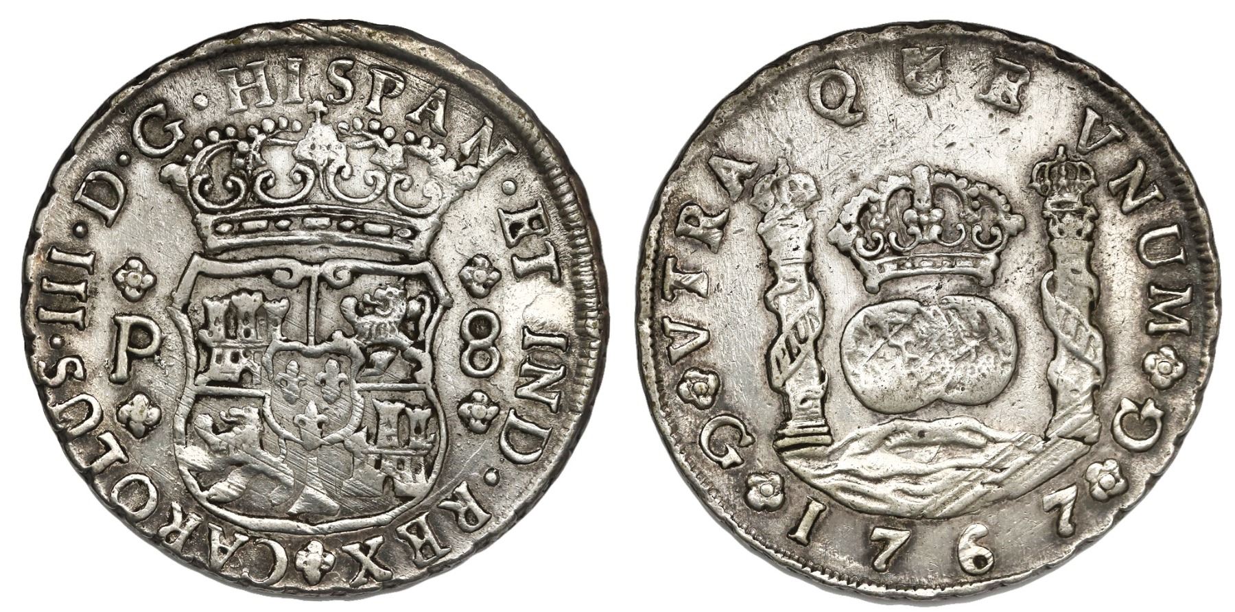 Guatemala, pillar 8 reales, Charles III, 1767P.
