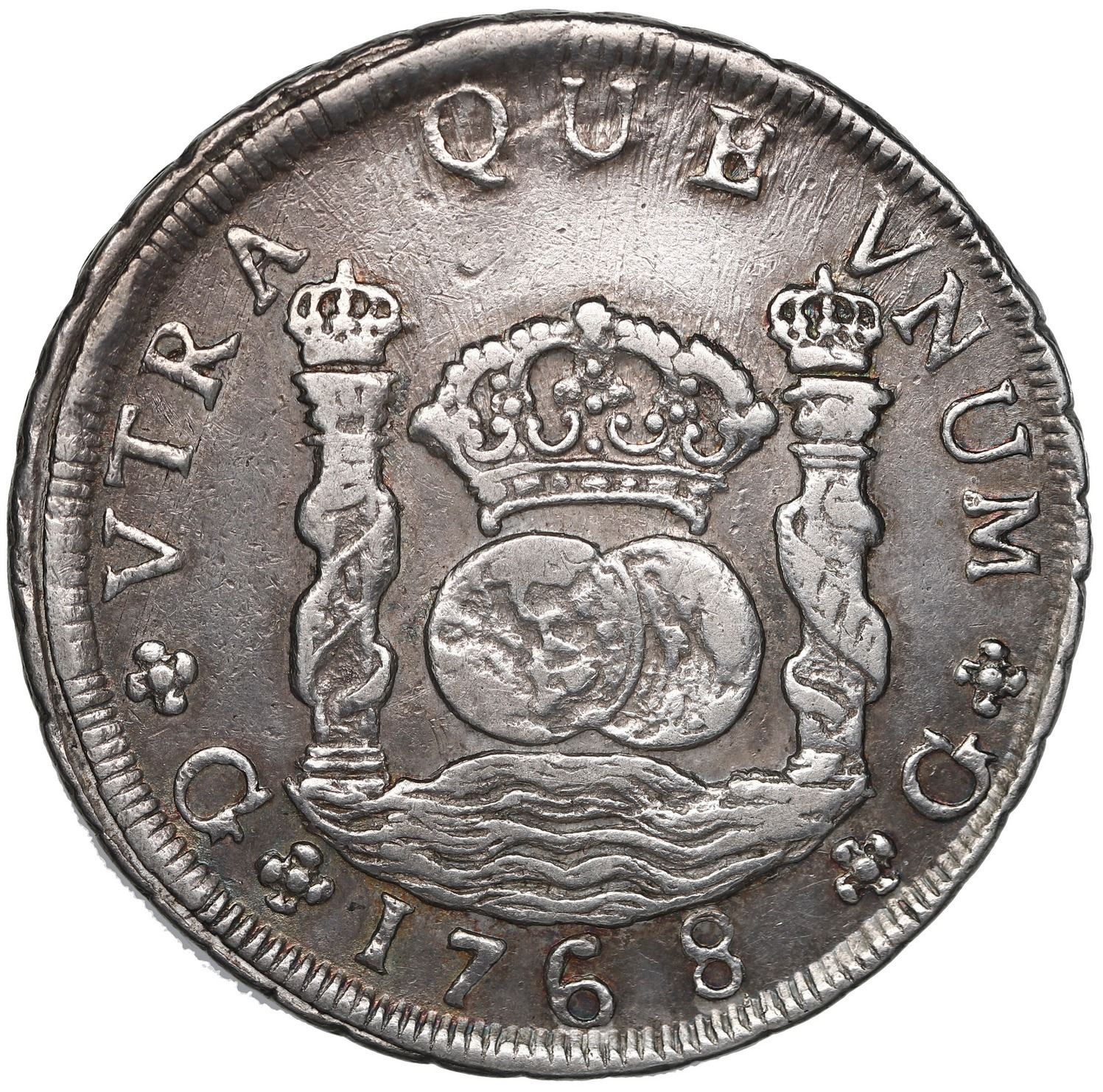 Guatemala, pillar 8 reales, Charles III, 1768 P. Yonaka-G8.68a; JP-8R37; Cal-1000; KM-27.1. 26.78 grams. Attractive, broad-flan XF with full rims, nice toning, odd metal-flow lines radiating from crown to QUE.