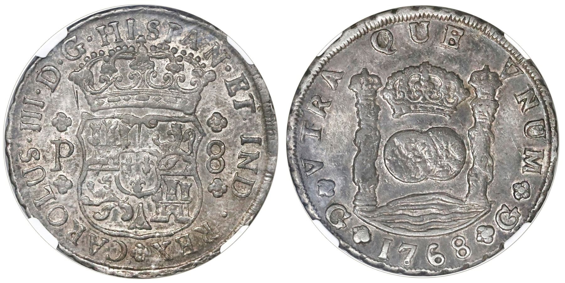 Guatemala, pillar 8 reales, Charles III, 1768P, NGC AU 50. KM-27.1; CT-817. Lightly toned all over, nice strike with remaining luster, choice strike. NGC #4494590-014.