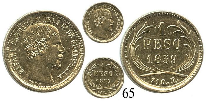 Guatemala, un peso, 1859R, Rafael Carrera. KM-179. 1.6 grams. Lustrous AU-, no problems, yellow color.