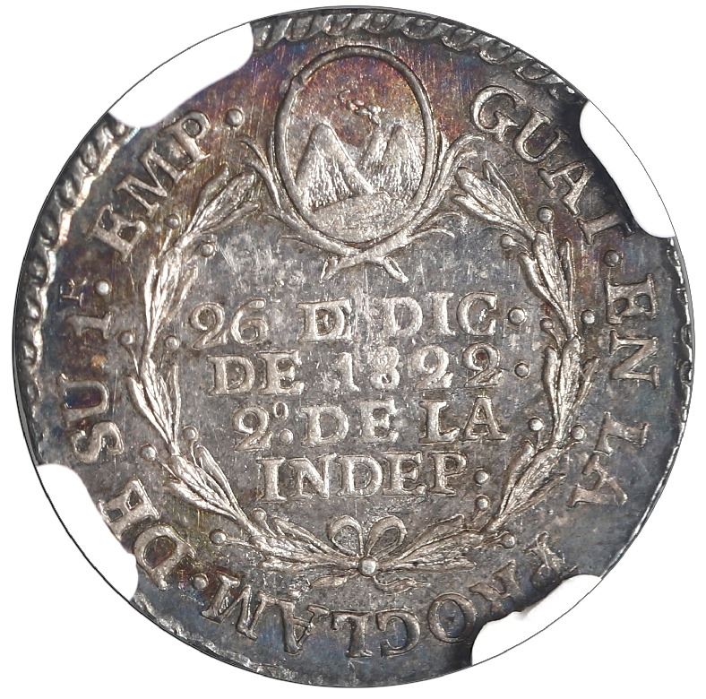 Guatemala (under Empire of Mexico), silver 1 real-sized proclamation medal, Agustin Iturbide, 1822, rare, NGC AU 58. Fonrobert-7207; Grove-34a. Obverse with bust inside legend AGUSTIN I. EMPERAD . DE MEXICO.; reverse with mountains-in-oval emblem at top, legend GUAT. EN LA PROCLAM. DE SU 1R. EMP. around laurels surrounding 26 E DEC. / DE 1822. / 2o DE LA INDEP. in center. Steely gray-toned obverse, bright reverse with sunset hues around the top, boldly struck with just a touch of surface friction on the high points. Please use this link to verify the certification number