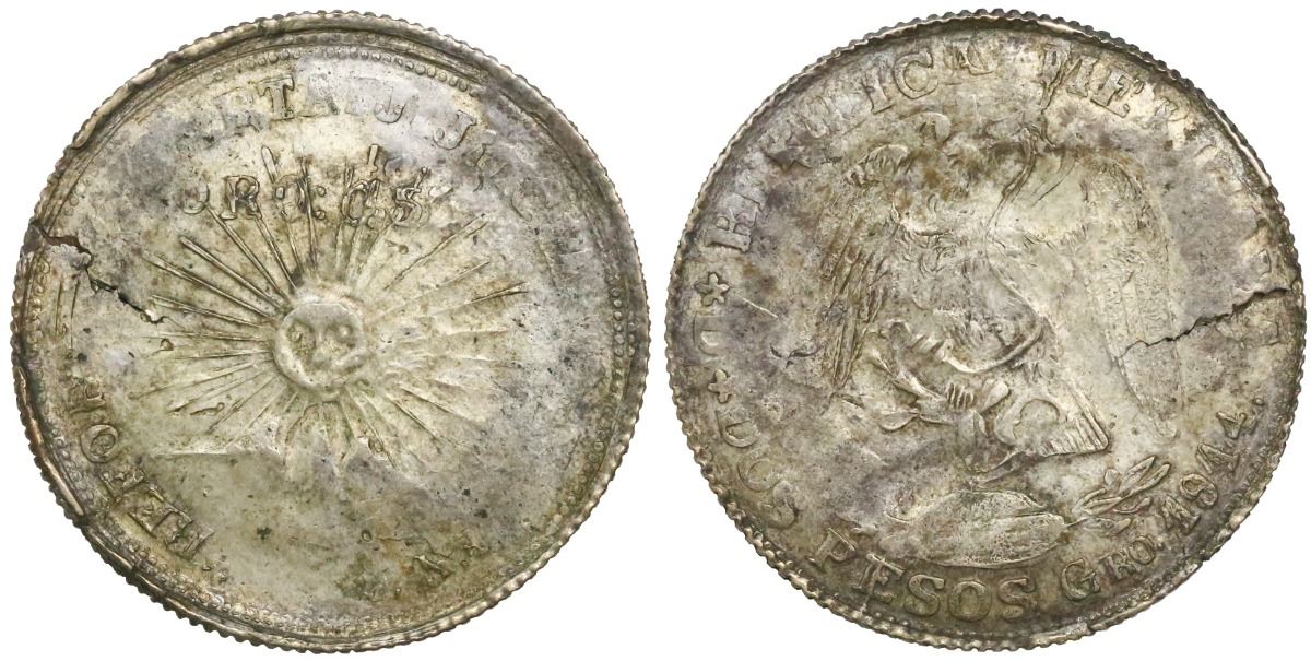 Guerrero, Mexico, 2 pesos, 1914. KM-643. 15.81 grams. Extremely crude coin, but still AU with light gold toning, doubly or possibly triple struck (the legend appears to read *D* DOS PESOS due to the multiple strikes) on a cracked and underweight planchet due to the brittle goloid alloy.