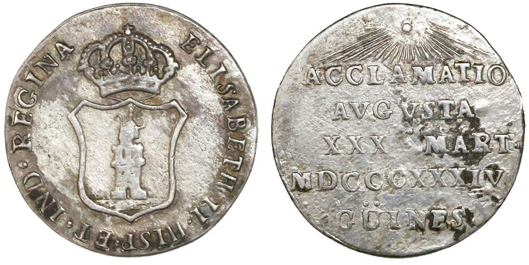 Guines, Cuba, silver 1R-sized proclamation medal, Isabel II, 1834, rare. Herrera-44; Medina-414. 2.92 grams. Lightly cleaned XF, somewhat crudely made with weak rims, patchy dark toning.