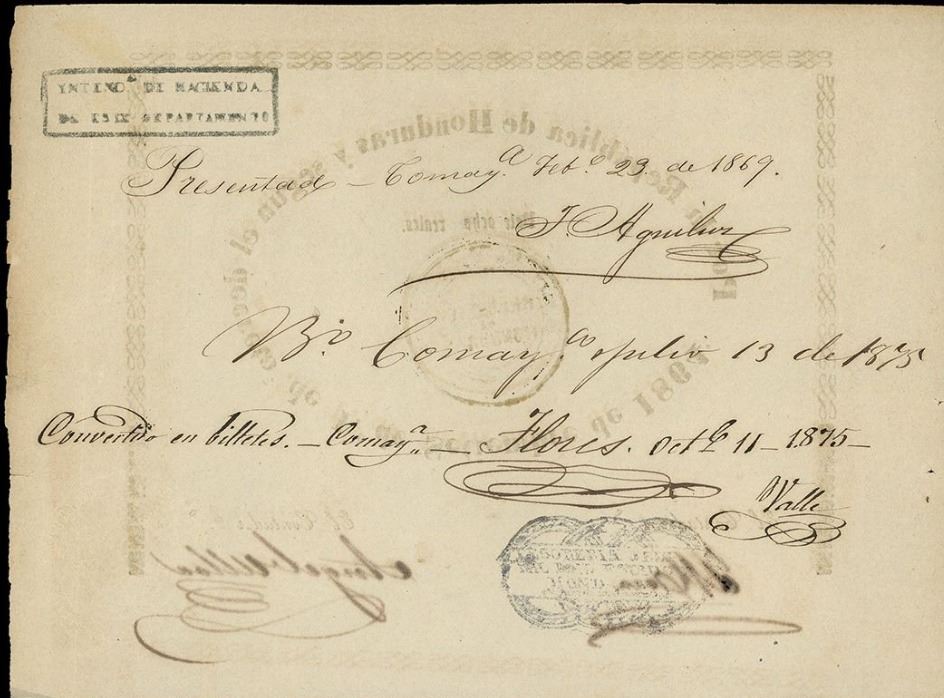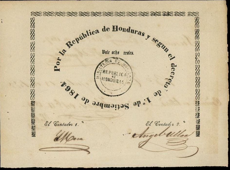 HONDURAS, 8 reales, 1-9-1864, with embossed and inked Ministerio de Hacienda stamps, rare. Pick-unl.