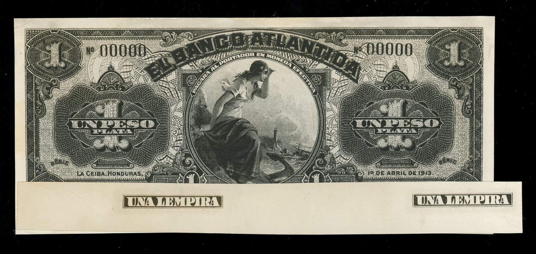 HONDURAS, Banco Atlántida, 1 peso photographic proof, 1-4-1913. Pick-S111p (type of). This photographic proof from the American Bank Note Company archives shows the design process for the 1913-dated peso plata note and its later iterations as an una lempira note with a pasted-on denomination strip along the bottom. Subtle changes between this photographic proof and the finished notes show that this prototype was modified before its printing run.