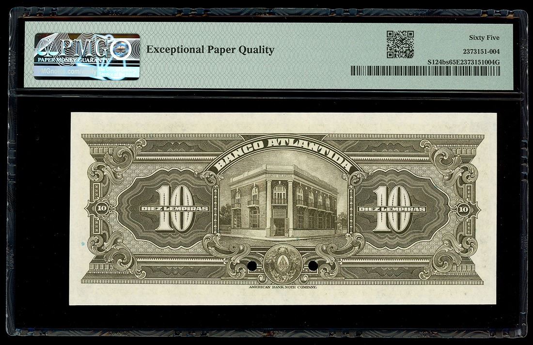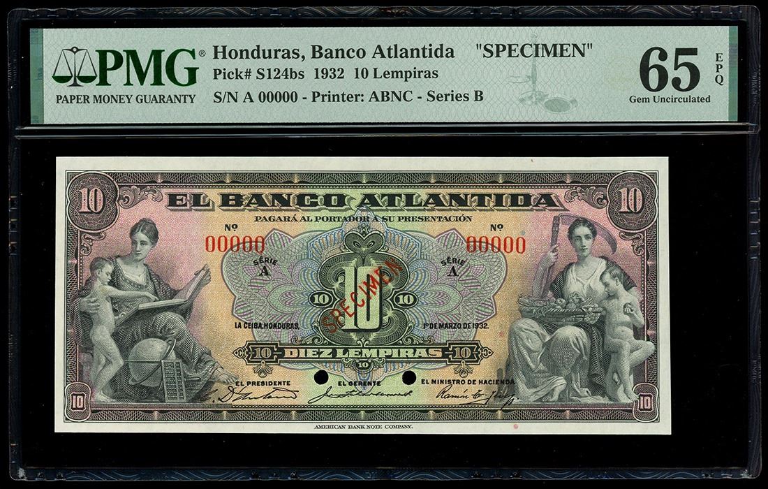 HONDURAS, Banco Atlantida, 10 lempiras specimen, 1-3-1932, series A, PMG Gem UNC 65 EPQ. Pick-S124bs. Colorful and attractive Honduras specimen note with two allegorical vignettes on the face and a vignette of the bank on the reverse. Gem note with great ink colors and paper quality, two punch hole cancellations over the signatures, red SPECIMEN overprint at center, tied with one other for second finest known in the PMG census (one finer in 67 EPQ).