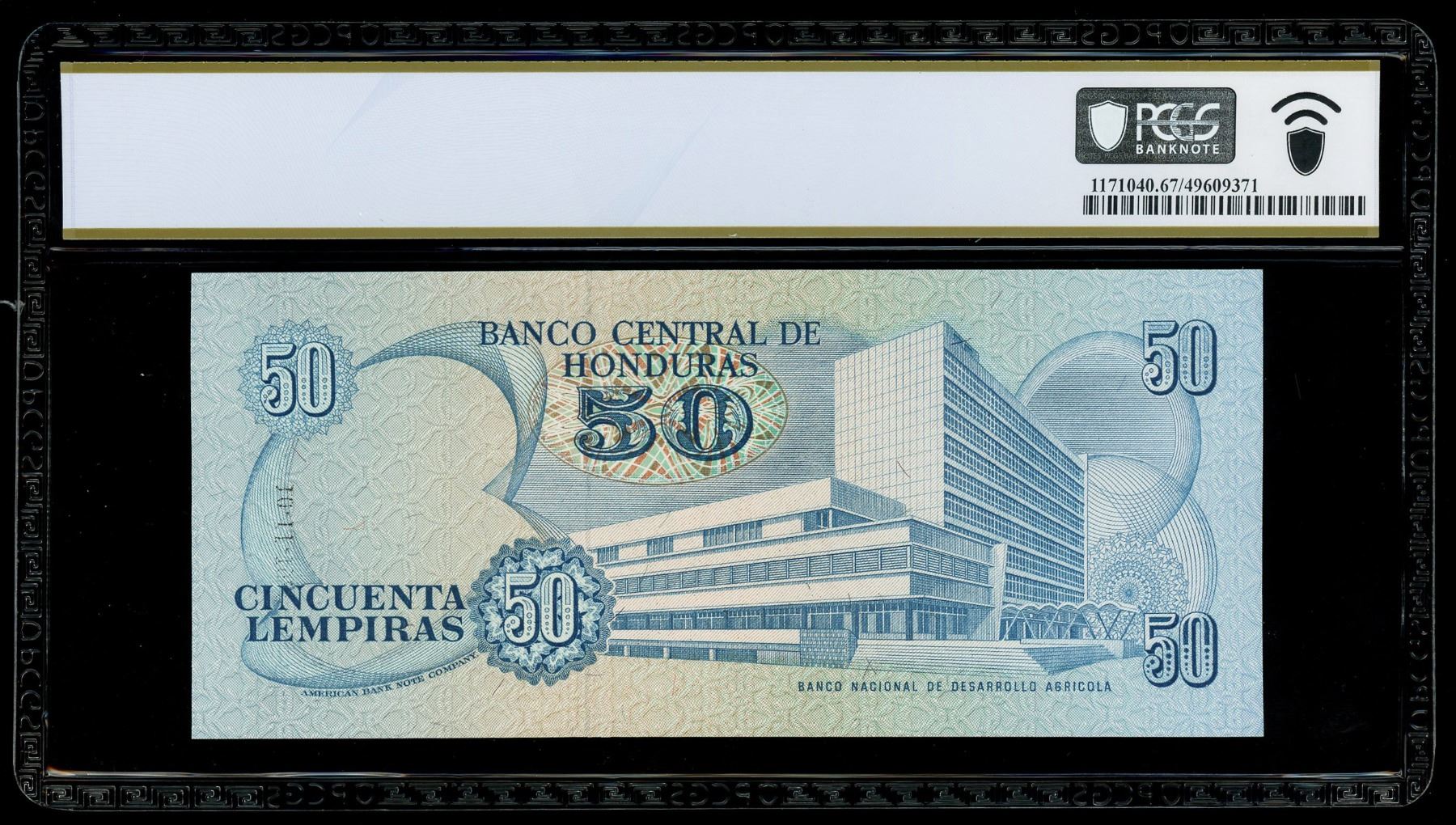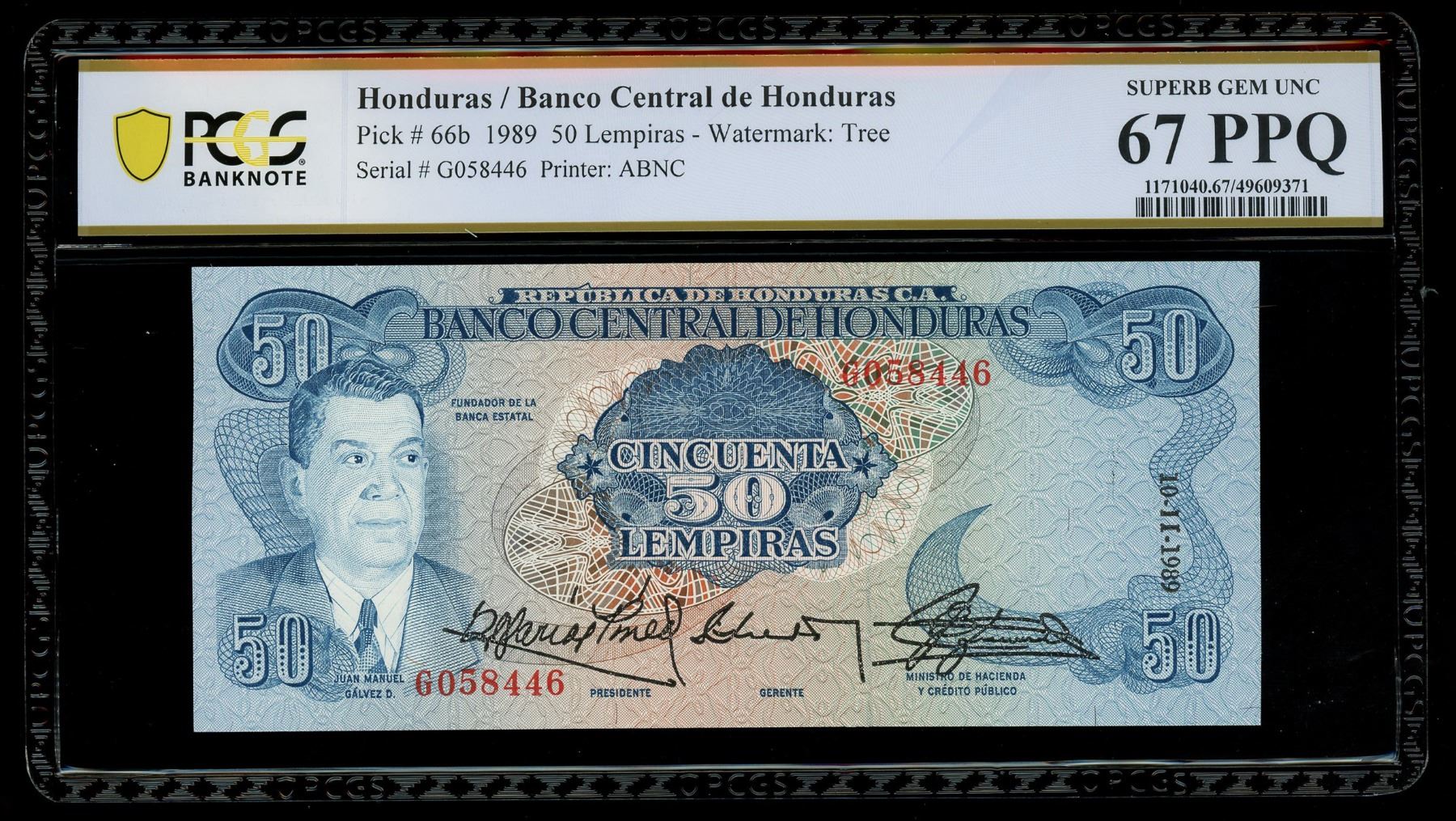 HONDURAS, Banco Central, 50 lempiras, 10-11-1989, serial G058446, PCGS Banknote Superb Gem Unc 67 EPQ, finest known in PCGS census. Pick-66b. A beautiful Gem note with bold ink colors, nice centering and corners plus strong embossing, the sole finest example seen at PCGS.