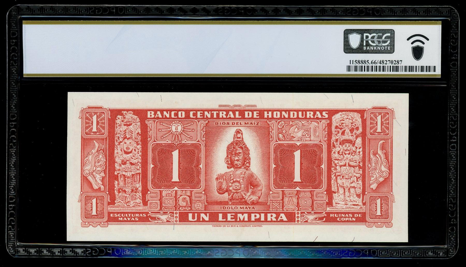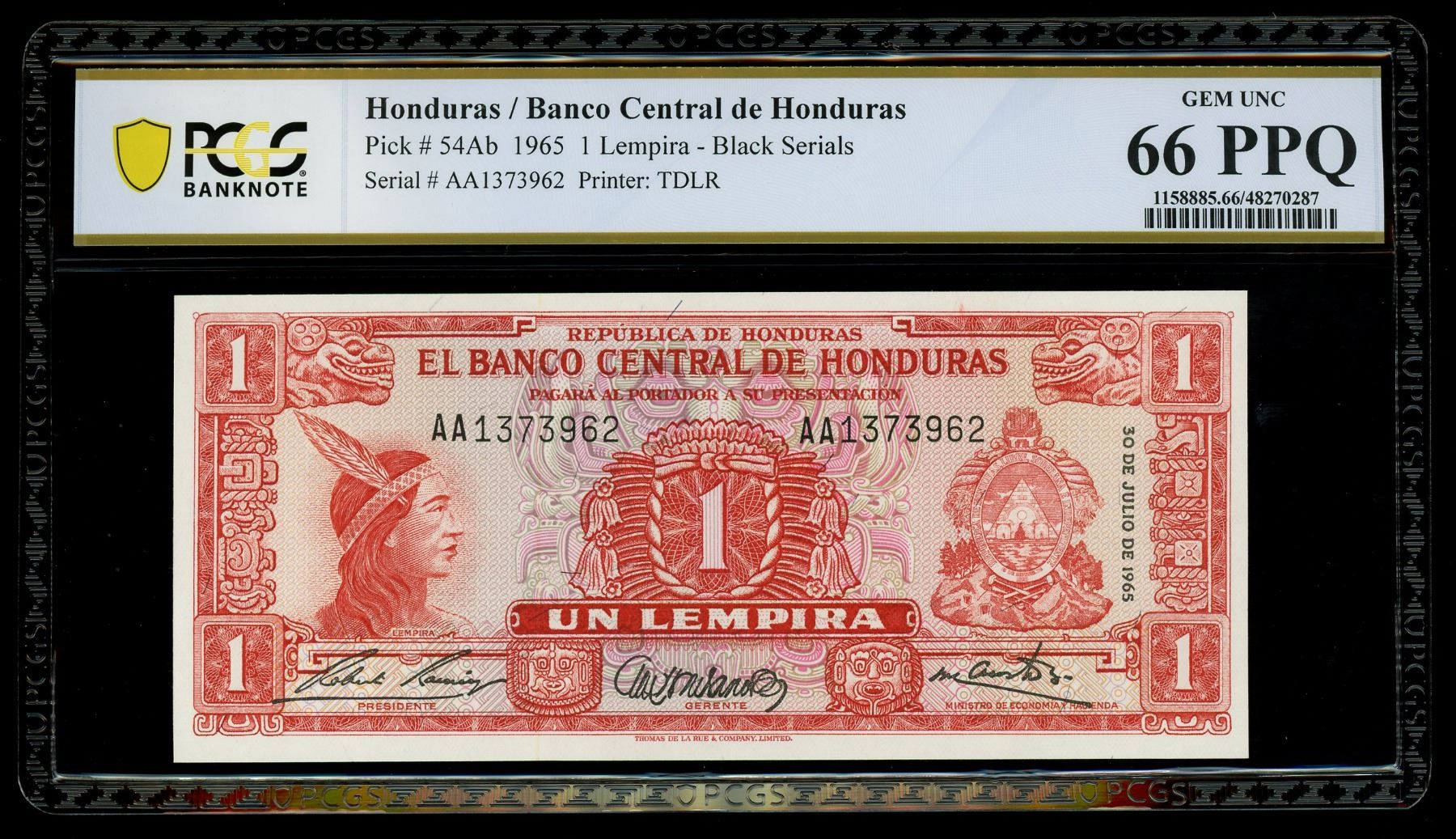 HONDURAS, Banco de Honduras, 1 lempira, 30-7-1965, serial AA1373962, PCGS Banknote Gem UNC 66 PPQ. Pick-54Ab. Nice Gem note with great paper quality and vivid red inking.