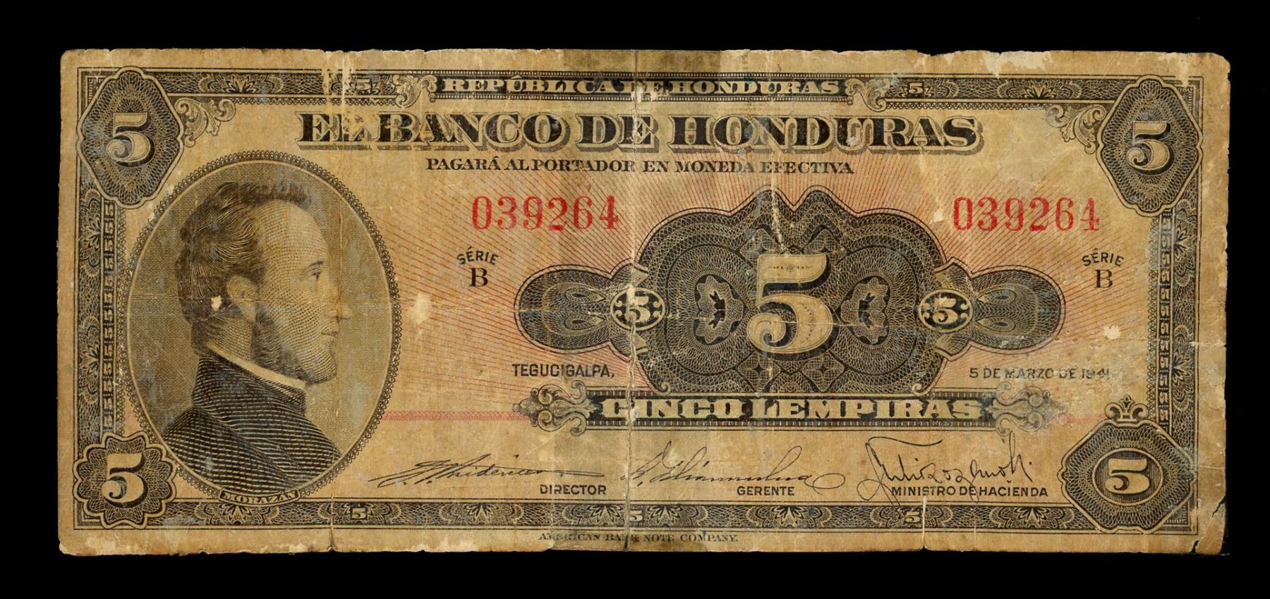 HONDURAS, Tegucigalpa, Banco de Honduras, 5 lempiras, 5-3-1941, series B, serial 039264, with 25-5-1