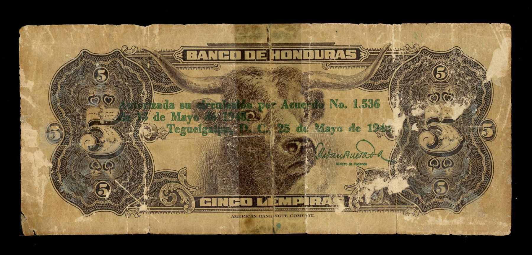 HONDURAS, Tegucigalpa, Banco de Honduras, 5 lempiras, 5-3-1941, series B, serial 039264, with 25-5-1948 green overprint on back. Pick-42b. Similar to the prior lot, this 1941-dated 5 lempiras features a large bull's head vignette across the back. However, this note also features the green 1948-dated overprint on the back, a considerably rare type. This about Very Fine note was once laminated and has some paper pulls across the back, and a central split is also repaired with tape. Though with some problems, this Honduras rarity is difficult to acquire in any condition and we can account for no major auction appearances over the past decade.