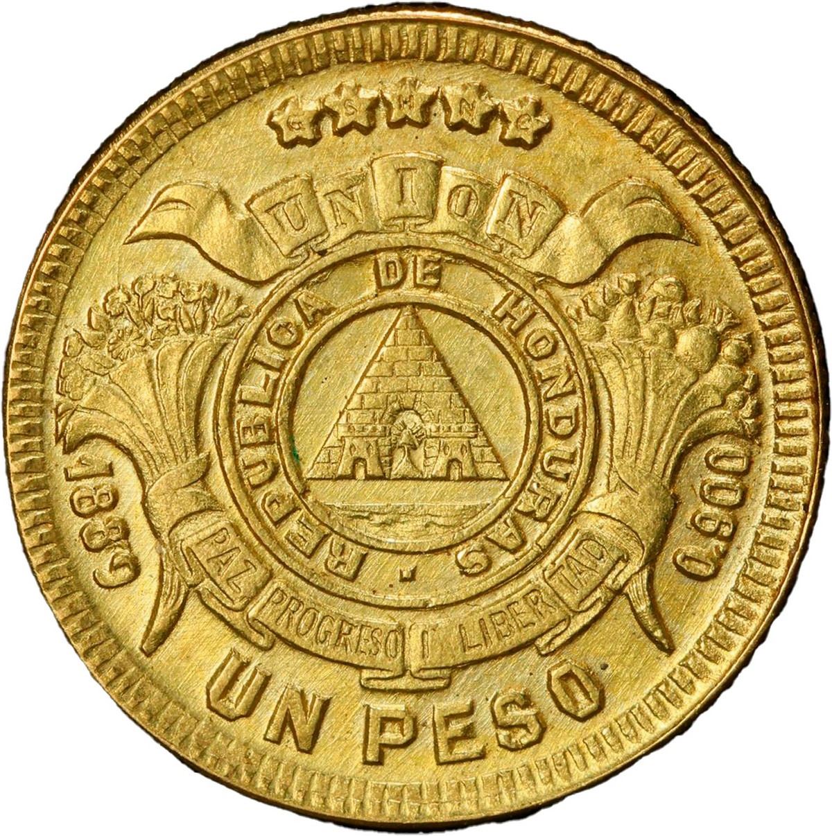 HONDURAS, Tegucigalpa, gold 1 peso, 1889, very rare, PCGS AU58,  top pop.