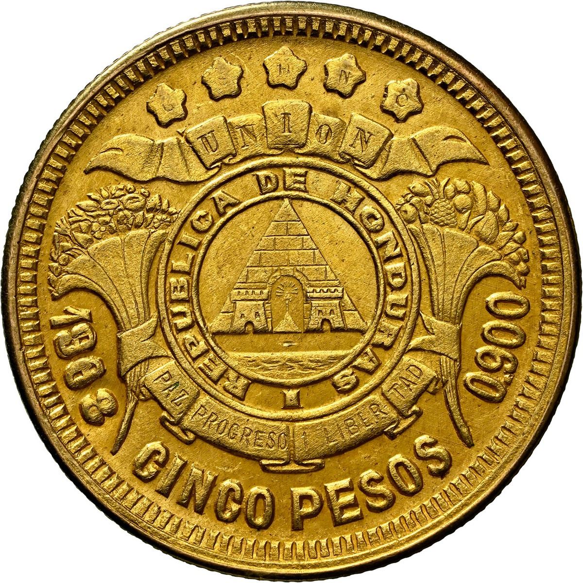 HONDURAS, Tegucigalpa, gold 5 pesos, 1908/888, very rare, NGC MS 61.