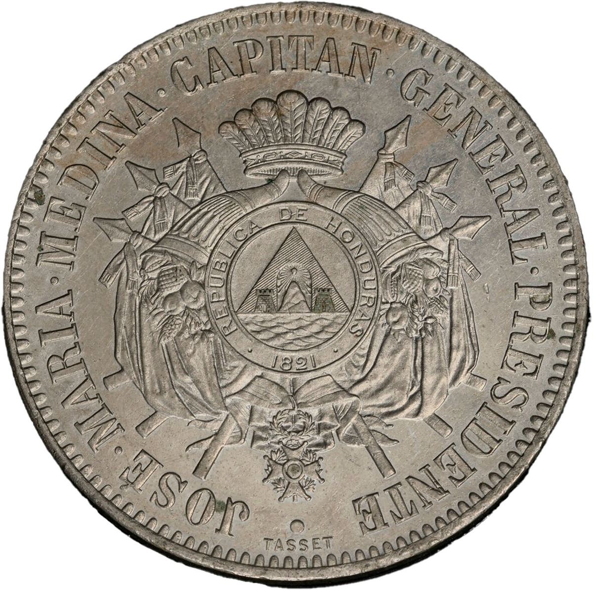 HONDURAS, struck at the Paris Mint, copper-nickel proof pattern 2 reales, President Medina, 1870-TASSET, PCGS SP63. Stickney-C279; KM-Pn11. Faintly toned over reflective fields and slightly frosty details with a few small dark spots here and there, decent grade for this popular pattern series of denominations that were never adopted, also noteworthy for its obverse legend recognizing Captain-General and President José Maria Medina (who was executed in 1878).