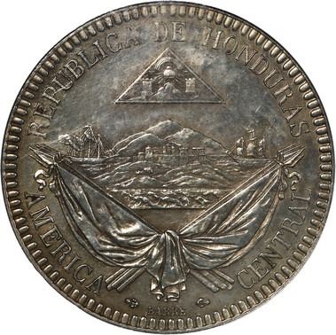 HONDURAS, struck at the Paris Mint, copper-nickel proof pattern essai 1 real, 1869, E below date, very rare, NGC PF 62, ex-Whittier. Stickney-unl; KM-Pn9. Bold strike, with light golden toning over luster, from a series of essais for a new copper-nickel coinage that ended in failure, replaced by dismal bronze issues, the original patterns like this being quite rare with only a few known. Pedigreed to the Whittier Collection (stated on label).