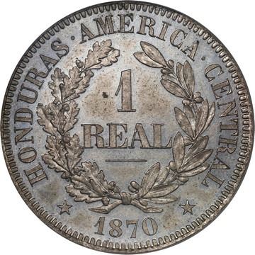 HONDURAS, struck at the Paris Mint, nickel proof pattern 1 real, President Medina, 1870-TASSET, ANACS PF62. Stickney-C279; KM-Pn10. Frosty details and mirror fields with faint traces of golden toning, no marks or flaws, from a popular pattern series of denominations that were never adopted, also noteworthy for its obverse legend recognizing Captain-General and President José Maria Medina (who was executed in 1878).