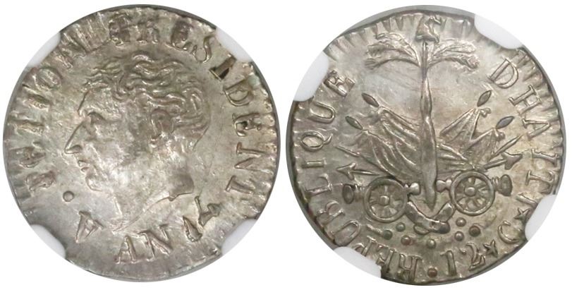 Haiti, 12 centimes, AN 14 (1817), Petion (large head), encapsulated NGC MS 61. KM-13. Lustrous with very light toning.