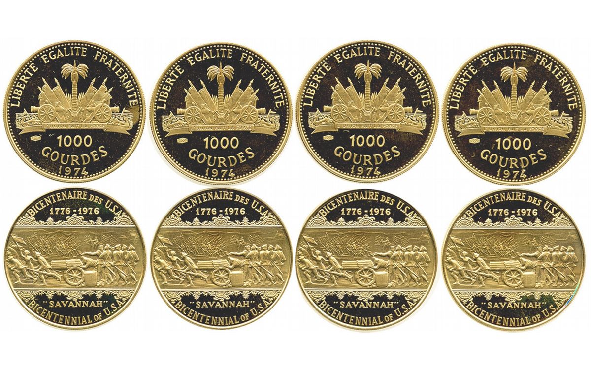 Lot of 4 Haitian proof 1000 gourdes, 1974, error without country name (each 0.3761 oz AGW). KM-118.2. Flawless proofs, bullion coins but worth a premium due to the error.