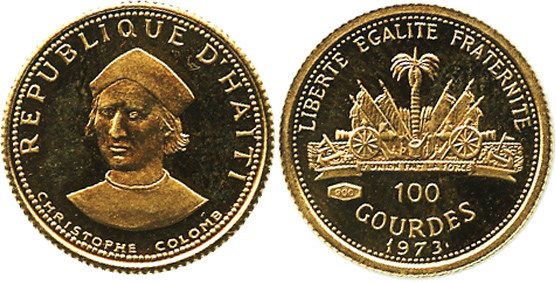Haiti, Proof 100 gourdes, 1973, in small wallet. KM-107. 1.4 grams. Light rub in field to left on obverse, otherwise typical perfect Proof, the original presentation wallet pristine, desirable as low mintage.