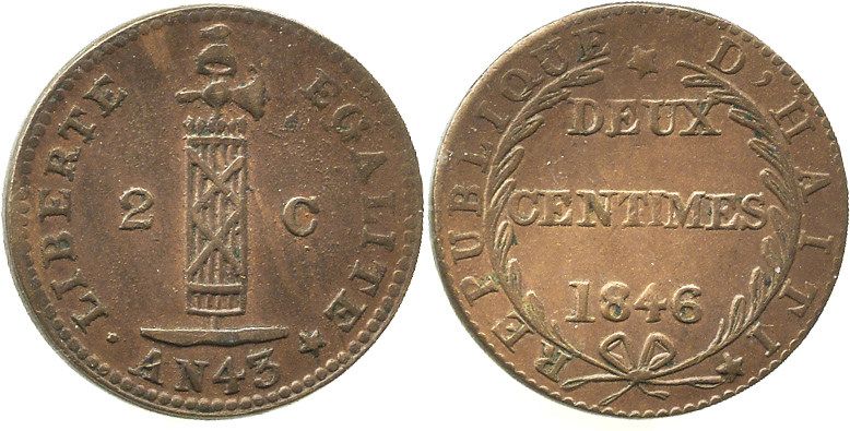 Haiti, copper 2 centimes, 1846 // AN43, local issue.