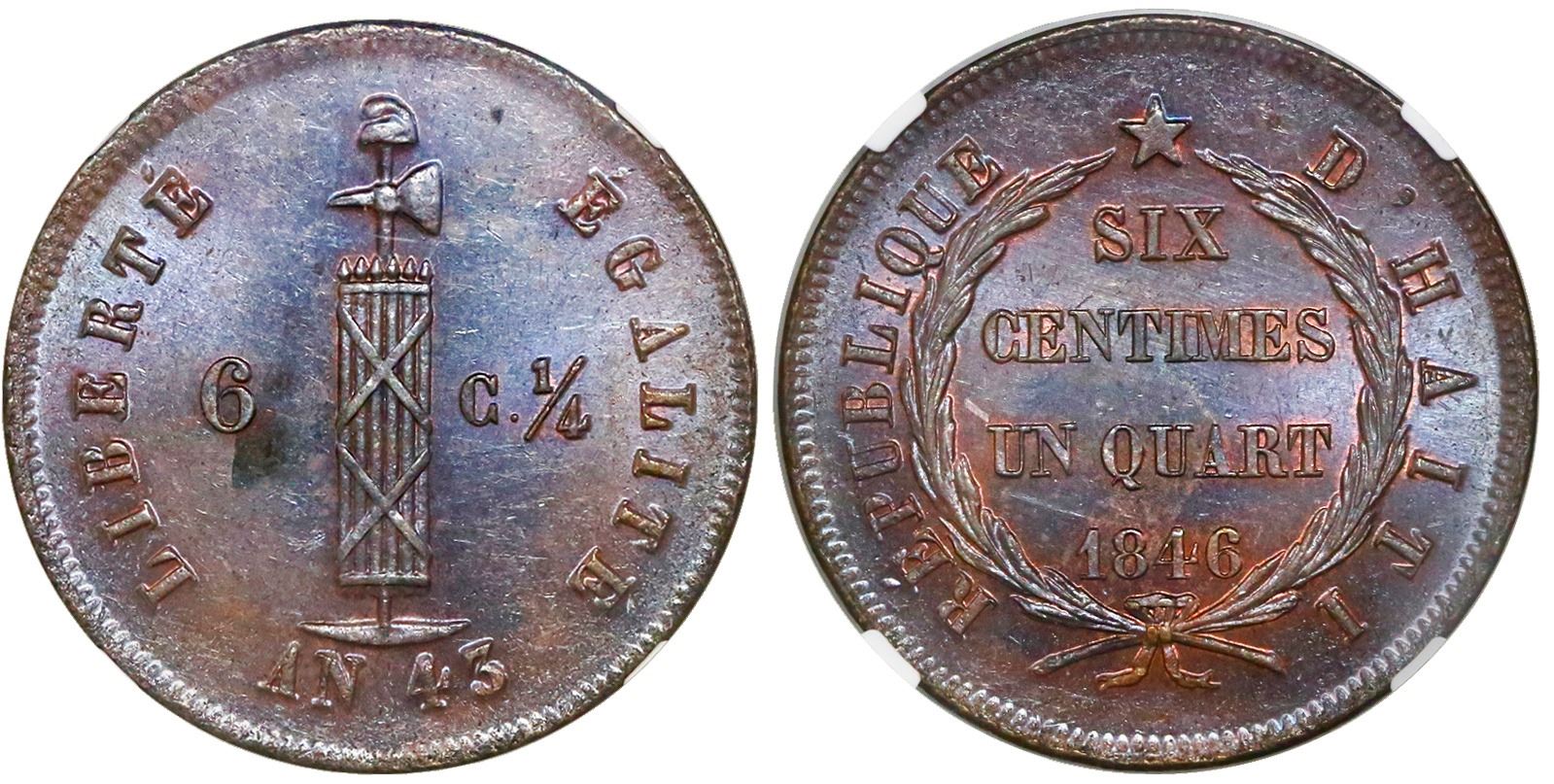 Haiti, copper 6-1/4 centimes, AN 43 / 1846, NGC MS 62 BN.