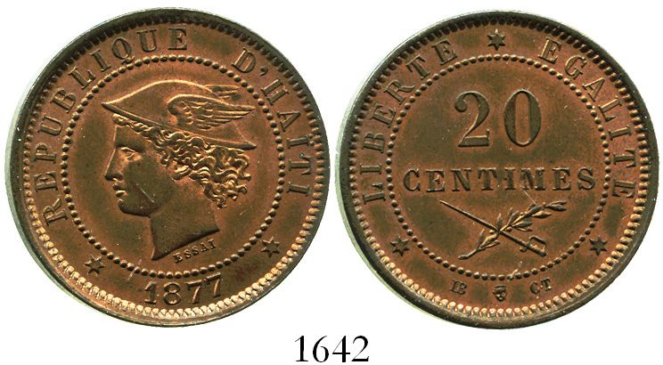 Haiti, copper essai 20 centimes, 1877. KM-Pn75; Rudman-278. 10.0 grams. UNC with lovely original color but no luster.