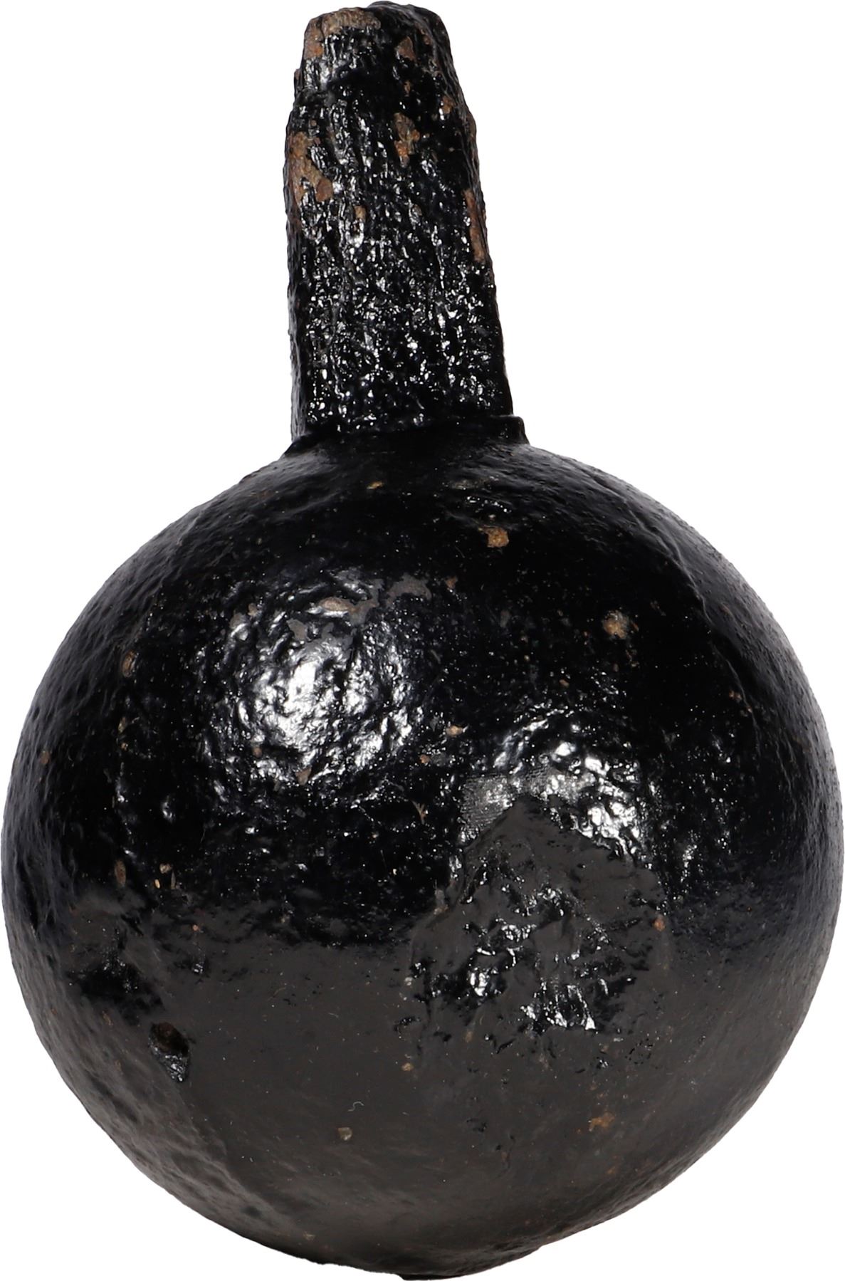 Half of an iron barshot, professionally conserved, ex-1733 Fleet ("Coffins Patch" site). 15.4 lbs (7030 grams) total. Ball diameter 4½"; 7¼" long total. A complete and sturdy ball with square-shanked bar segment protruding, shiny black all over, stable and uncorroded except for a small patch on the ball. Pedigreed to Sedwick Auction 11 (lot 1433).