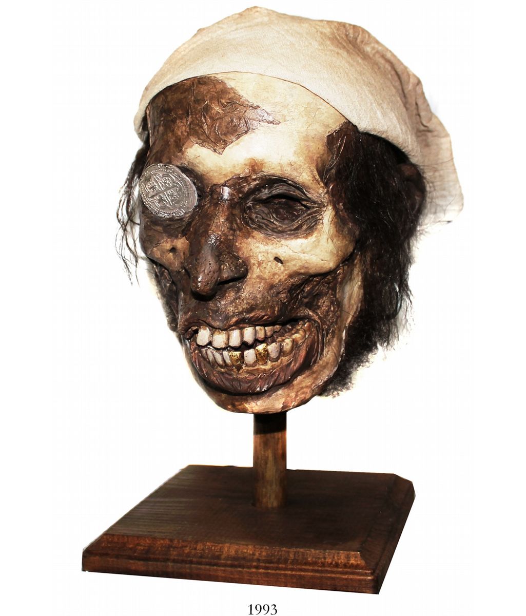 Hand-crafted mummified pirate head by local artist Barry Anderson. 1570 grams and 13" tall (including stand). One of the highlights of our Auction #8 was a mummified head of the pirate Blackbeard, hand-crafted by the same artist as this piece, which is intended to be the head of a pirate whose head was preserved in salt (hence the artist's name for this piece "Salty"), with real human hair and faithfully reproduced skin and bones and even teeth (some painted gold), also with a replica "piece of eight" in one eye socket. About the artist: Barry Anderson has spent the past 27 years working as an artist in Florida. He is accomplished as a commercial and fine artist as well as a special effects makeup artist for film and television. Since 1994 Barry has created museum figures for Ripley's Entertainment (where he is the Director of the Arts Department), which has enabled him to study genuine mummies, shrunken heads, trophy skulls and other unusual antiquities. Recently he traveled to Leymebamba, Peru, with mummy expert (and star of National Geographic's "Mummy Road Show") Gerry Conlogue, studying Incan and pre Incan Mummies with a group scientists from around the world. Barry's expertise in re-creating human remains and mummies has also brought him together with medical examiners, anthropologists and scientists in several documentaries and television programs as well as with police agencies for C.S.I. training and with military contractors for combat medic training. Barry's numerous film and television credits include: National Geographic's "Mummy Road Show"; Discovery Channel's "Super Sleuths"; P.B.S.'s "Secrets of the Dead - Gangland Graveyard"; and feature films "Hair Spray," "Jeepers Creepers," and George Romero's "Day of the Dead." With "death certificate" signed by the artist.