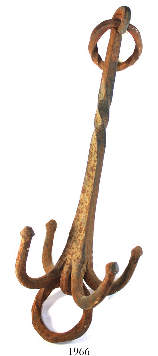 Hand-forged iron grappling hook, 1700s, found in Virginia. 2231 grams; 17" long. Long overall but with small (3") flukes, curiously with rings both at bottom and top, all three pieces cast with a double-twist, somewhat rusty but solid. With photo-certificate.