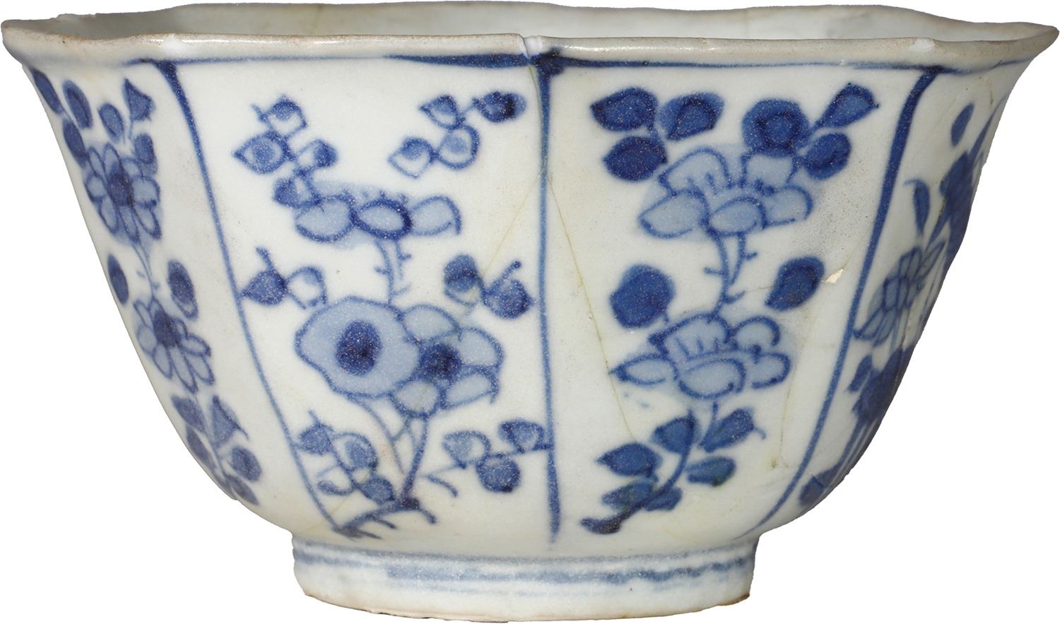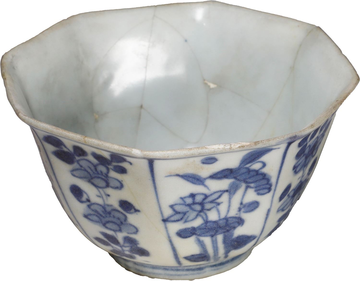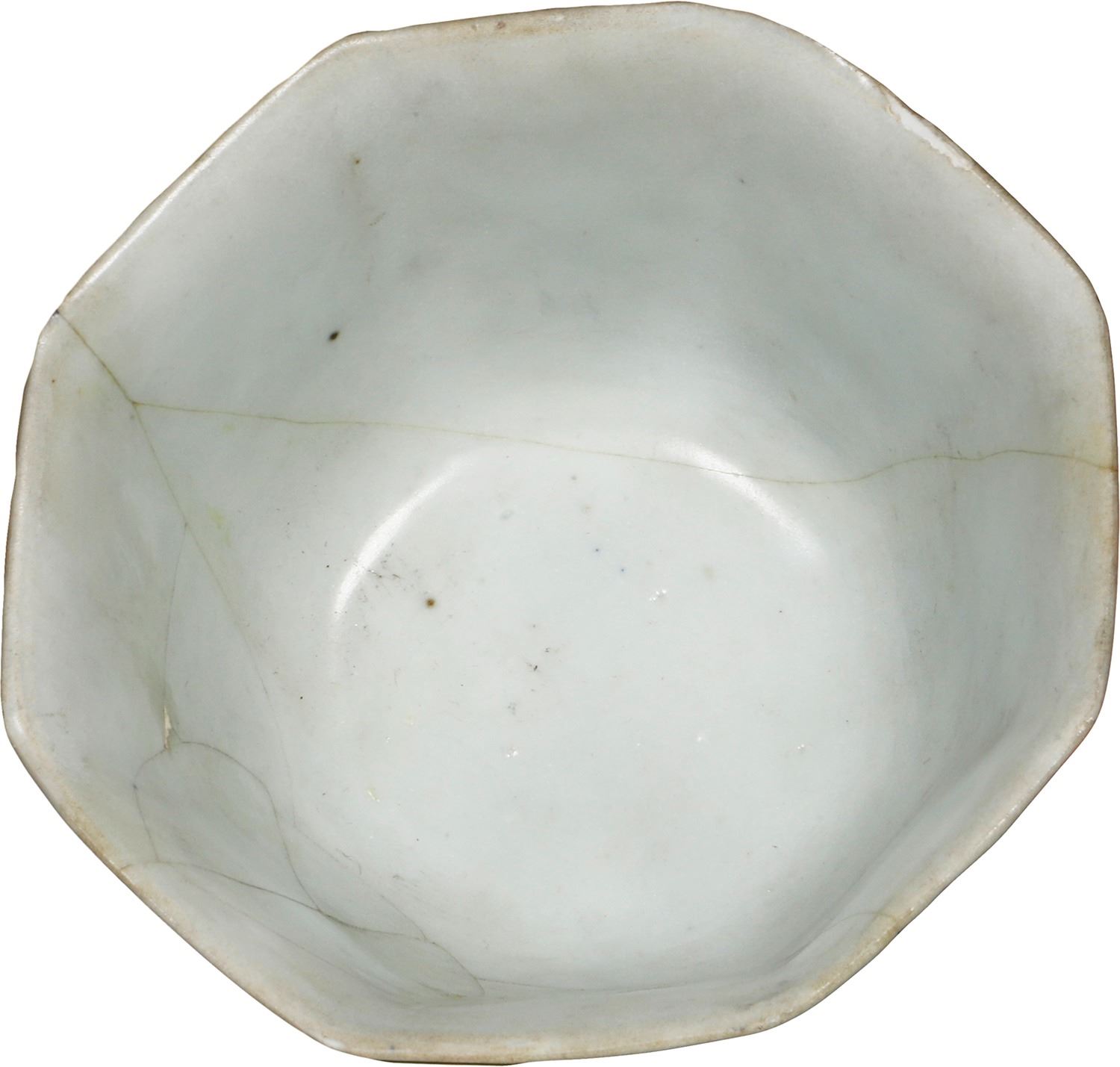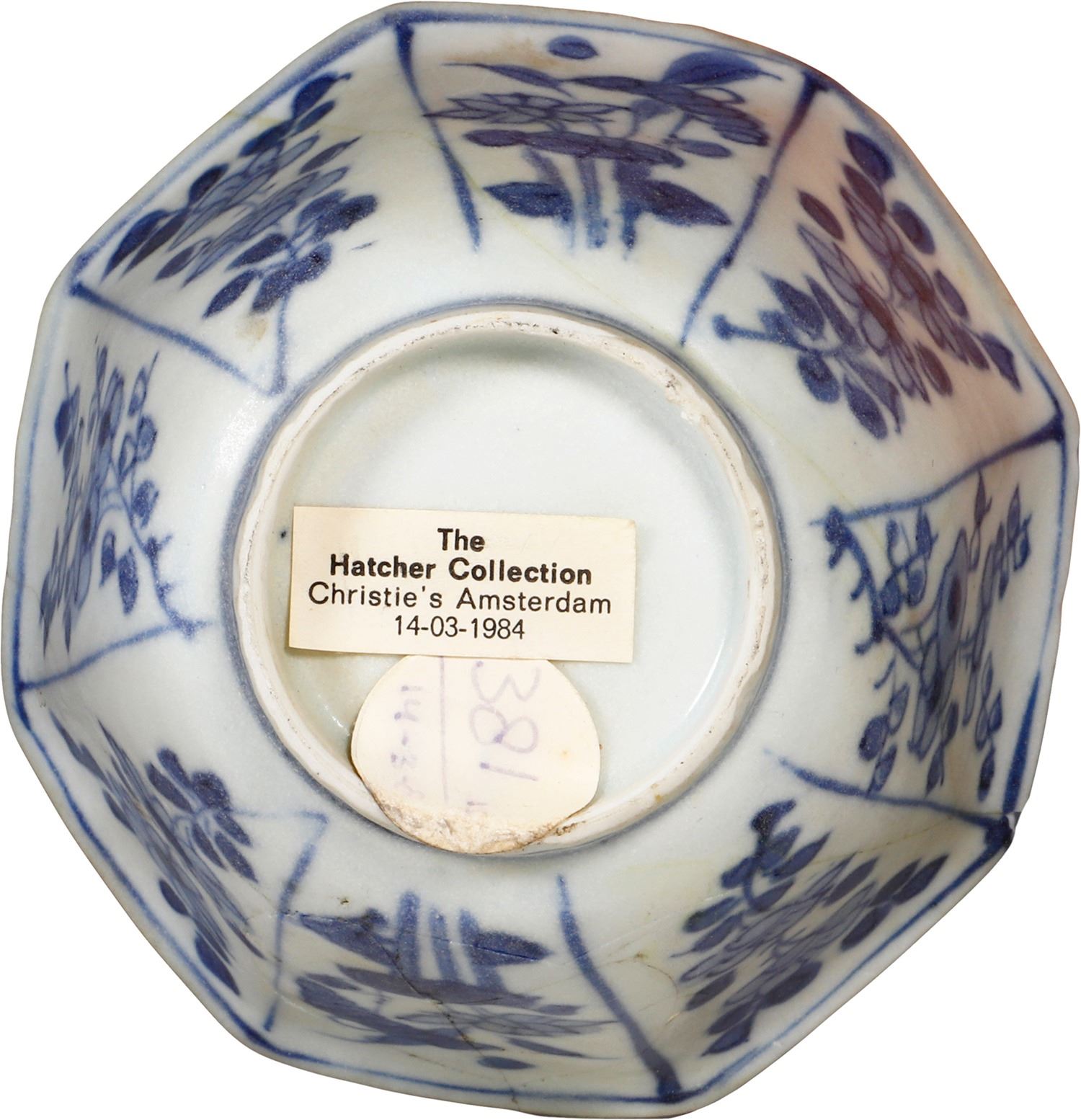 "Hatcher Cargo" Chinese blue-on-white porcelain bowl, octagonal shape, transitional period (1627-1662), ex-Chinese junk wreck of ca. 1645. 62 grams. 3¾" diameter, 2" tall. Small, light, octagonal bowl decorated with eight panels containing flowering plants, just a couple of small chips in rim and lots of interior crazing. Pedigreed to the "Hatcher Collection" of porcelains from a ca.-1645 Chinese junk wreck in the South China Sea and Christie's (Amsterdam) auction of March 1984, with original lot-sticker 381 (group lot) on bottom.