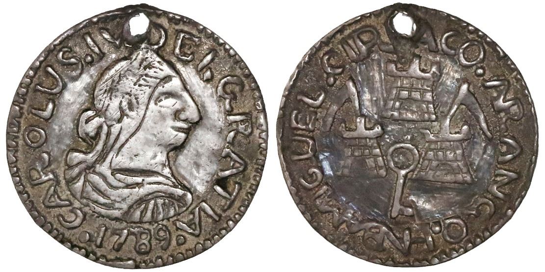 Havana, Cuba, cast silver 1 real-sized proclamation medal, Charles IV, 1789, very rare, PCGS Genuine. Herrera-151; Medina-175. 3.33 grams. Obverse: bust of Charles IV at center, 1789 below, legend CAROLUS IV DEI GRATIA encircling; reverse: castle without banner above, two castles flanking below with long banners, single vertical key in between, legend reads MIGUEL CIRIACO ARANGO HAB. XF, hole at top (as noted on PCGS label), contemporary tooling in fields and across bust contrasting with original bumpy (from casting) surfaces along legends, bold design elements, lighter color on obverse with orange toning around text, reverse with dark rainbow toning all over. PCGS #36211866.
