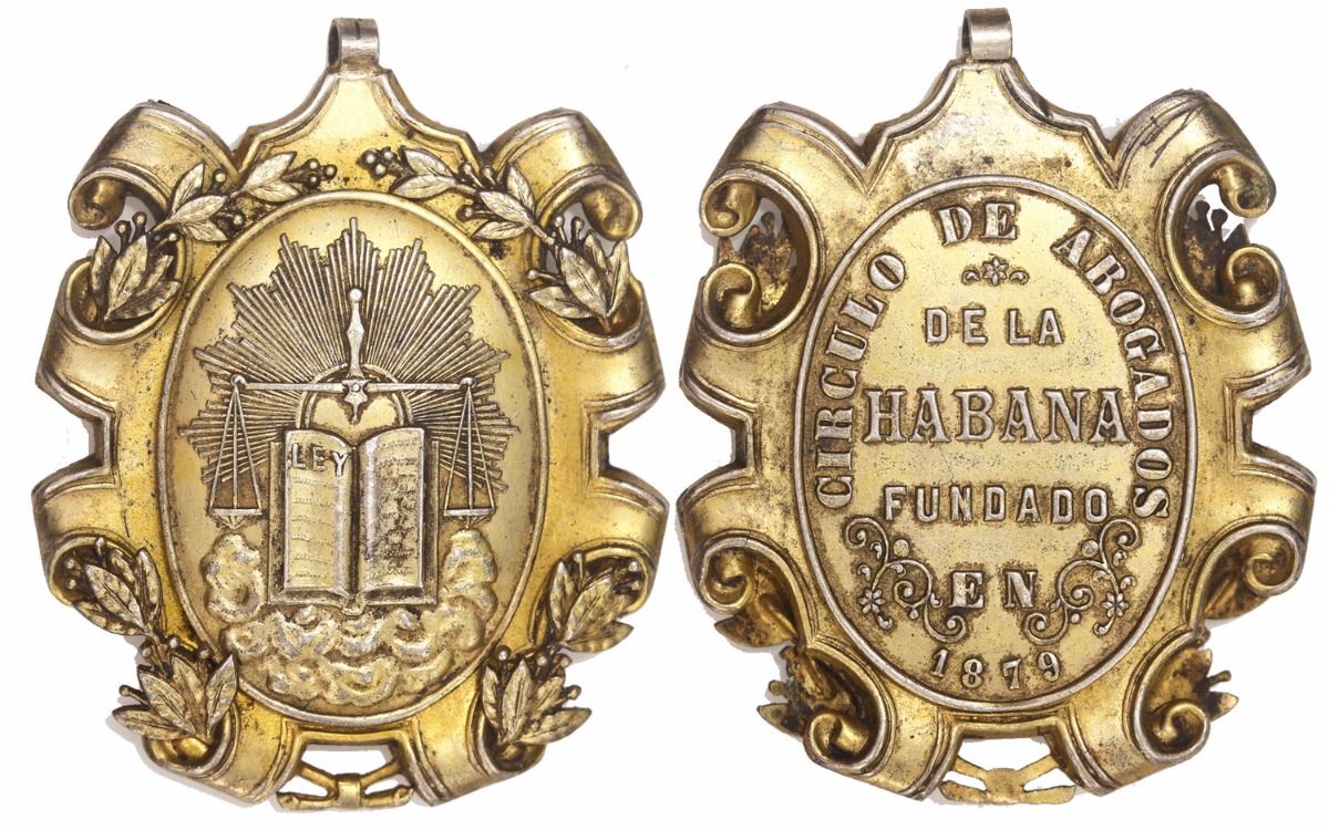 Havana, Cuba, gold-washed silver medalet, 1879, Circle of Lawyers in Havana, rare, ex-Roehrs. 26.29 grams, 55x42mm. Thick, hollow piece with law book and balance scale on one side, the other with CIRCULO DE ABOGADOS above DE LA / HABANA / FUNDADO / EN / 1879. XF or better, with most of the gold wash intact, with tiny loop at top incorporated into design. Pedigreed to the Edward Roehrs collection, purchased from Isaac Rudman, March 2002 (with tag).